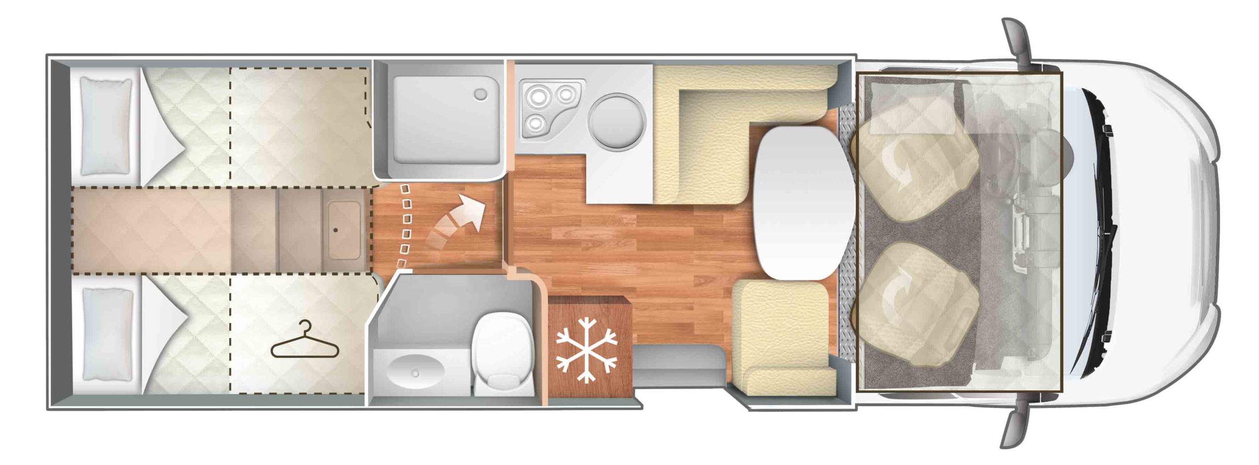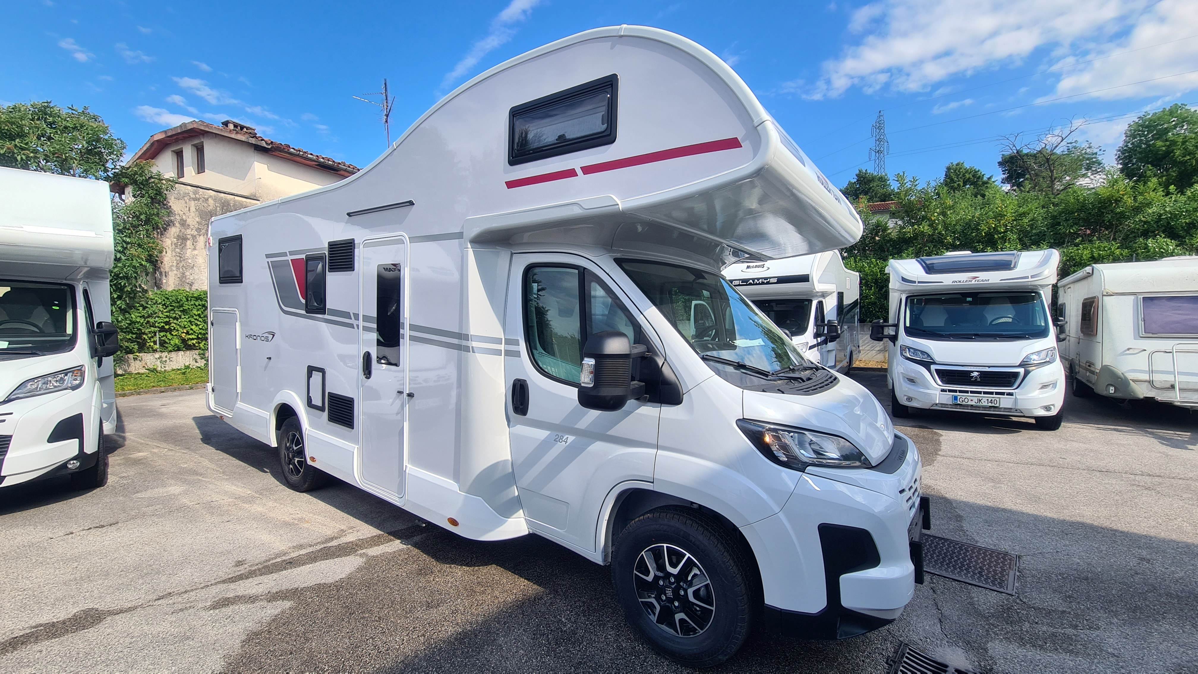 Zelo udoben avtodom za potovanje do 5 oseb, z 4 fiksnimi ležišči + možnostjo še dodatnih 2 ležišč.